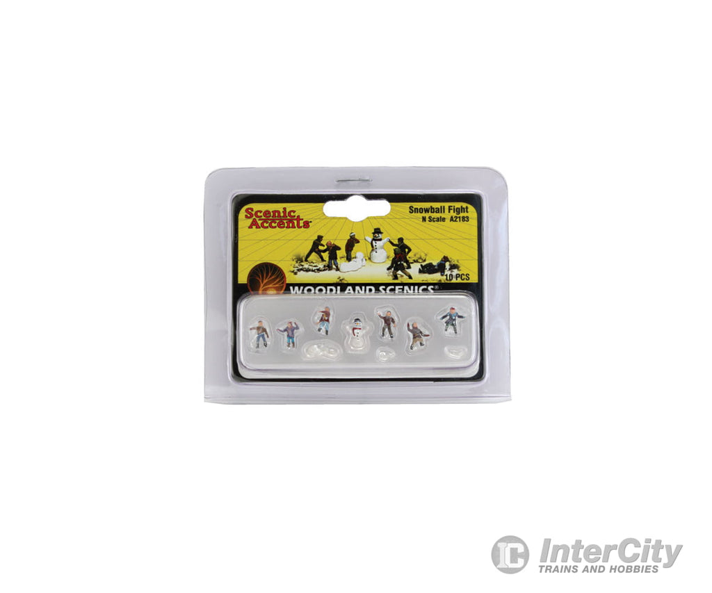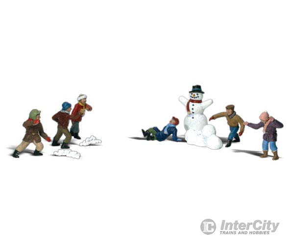 A set of six kids, several small and large snowballs, and a snowman. Five kids are engaged in the fight, while one has slipped and fallen to the ground.