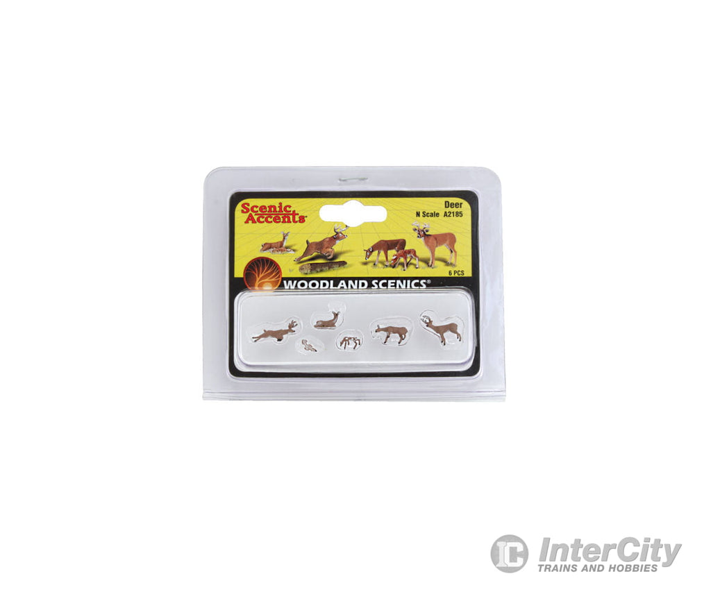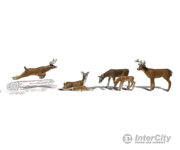A set of White Tail deer. A mighty buck is stretched in a full running jump, a doe sits by her fawn, while another doe and fawn graze. Another buck stands guard.