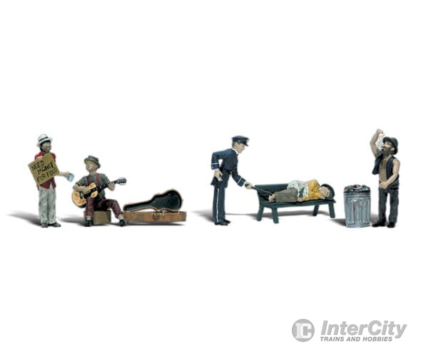The policeman is getting ready to wake a sleeping bum on a park bench. There’s also a bum searching through the trash, one bum with a "need money for food" sign and one with a guitar.