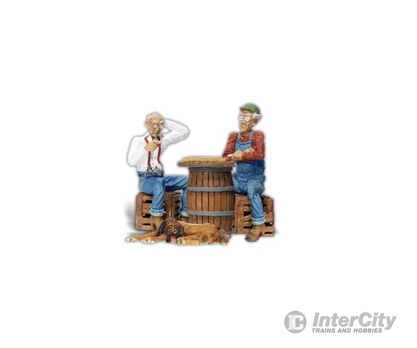 Two elderly gentlemen play checkers on an old whiskey barrel while an old hound dog sleeps.