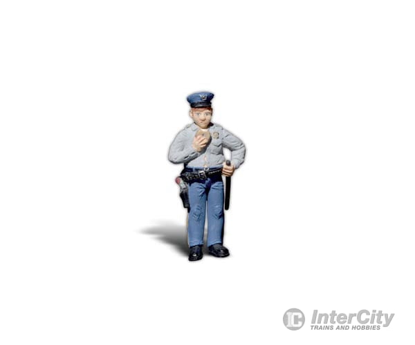This cop is walking the beat with his nightstick and doughnut in hand.