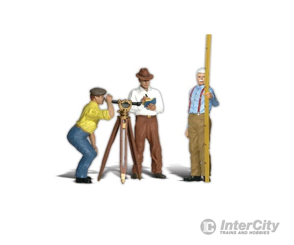 Three men surveying. One is measuring with the theodolite, while another is recording the horizontal and vertical angles. One man is holding a range pole.