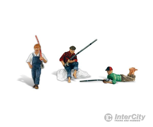Guys with poles and tackle enjoy a lazy afternoon by their favorite fishing hole.