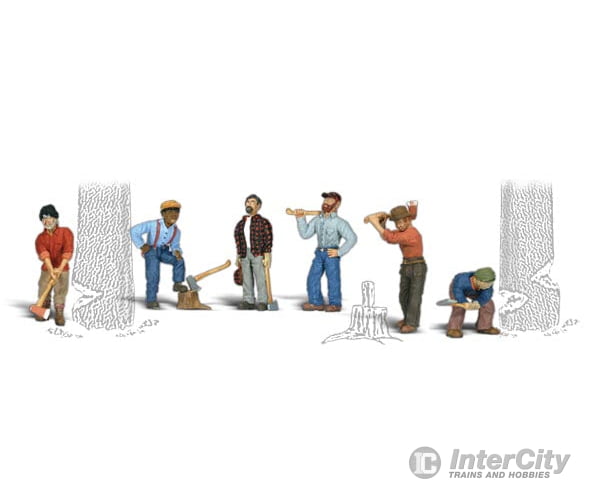 One man is crouching down to chop, one is taking a full swing, one man is at the end of his swing. One man is resting his legs beside an ax, on a stump, one man is holding his hat in one hand and an ax in another and the last man is resting his ax over his shoulder.