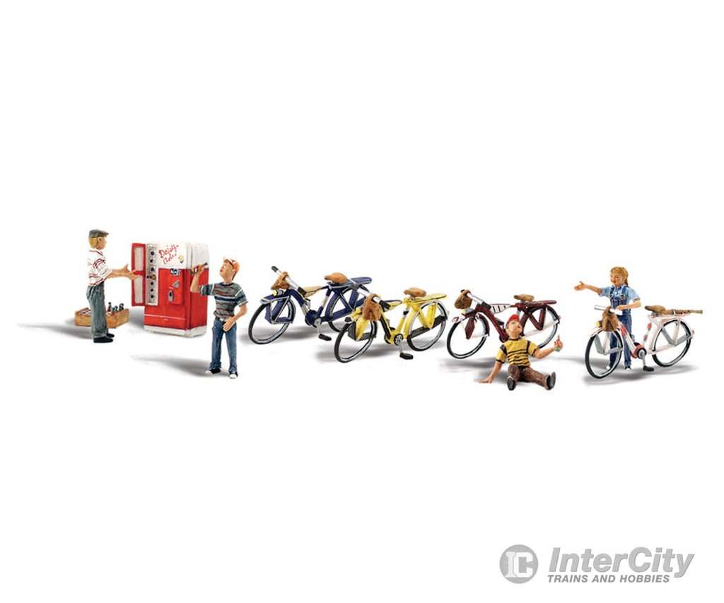 A set of four kids, with their bikes, take a break at the old pop machine.