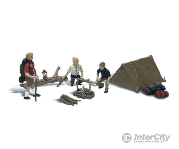 People with a tent, lantern, fire pit with firewood and sleeping bags.
