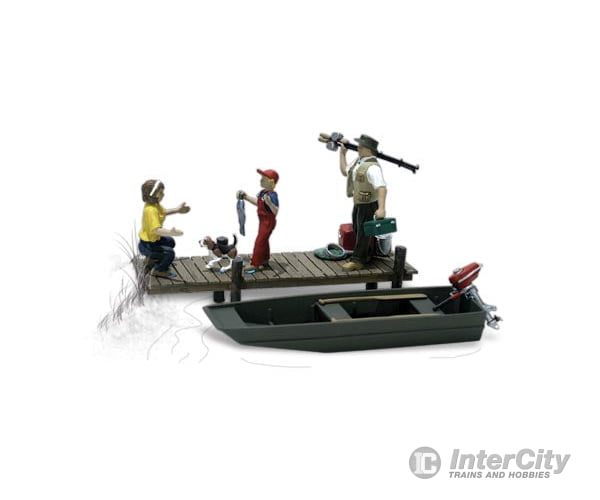After a day of fishing, this family and their dog dock the boat and unload their catch of the day.