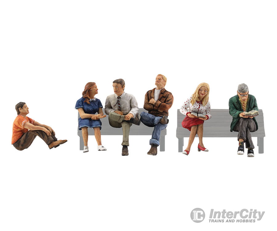 Set includes two women and four men. One man sits on the ground, with his back to a wall. A man and a woman sit reading books. One man and woman seem engaged in friendly conversation, while another man, in a leather jacket sits close by, arms crossed.