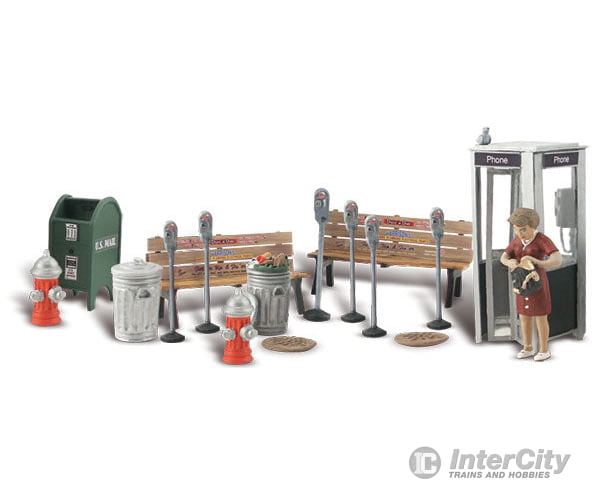 This set includes six parking meters, manhole covers, fire hydrants, trashcans, resting benches, street corner mailbox, a vintage folding-door telephone booth and a woman rummaging in her purse for some change.