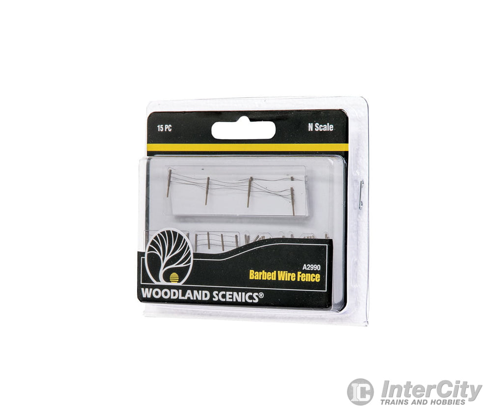 Line the edge of a pasture with handmade, pre-strung N scale Barbed Wire Fence. Barbed Wire Fences come with loose corner post support pieces and feature a double-gate. Simply place the fencing around an area, and then set the planter pins, drill and glue.