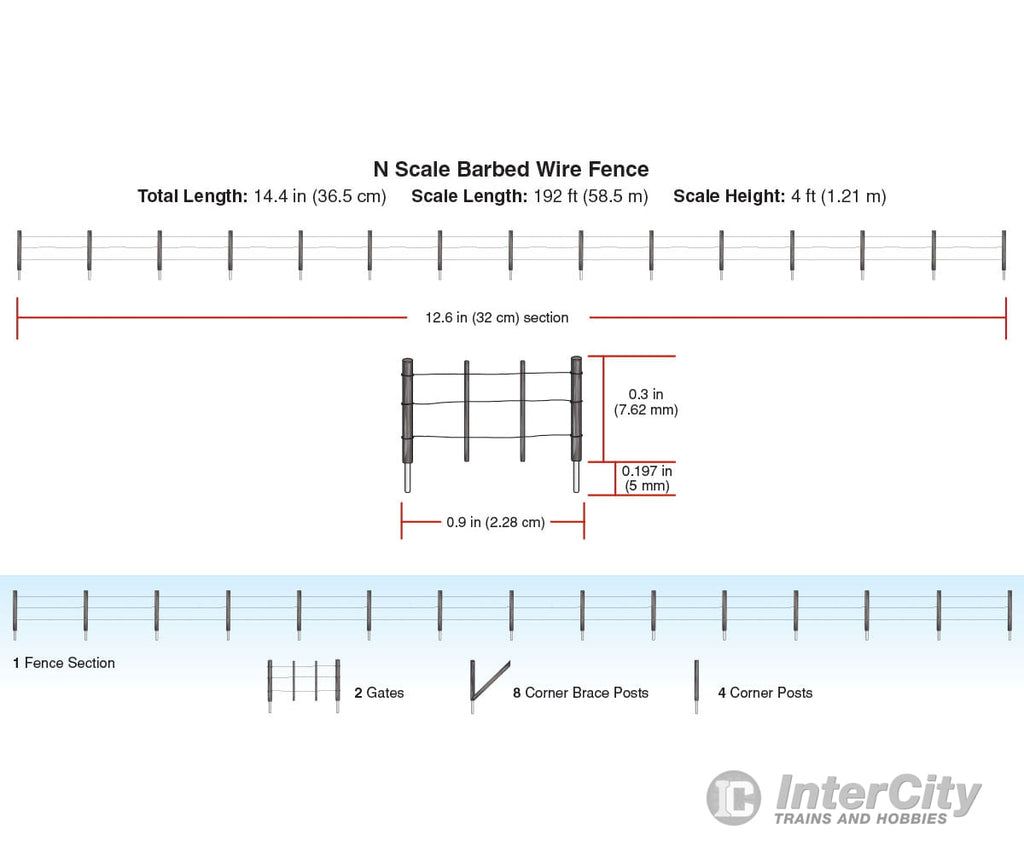 The total length of this fence is 14.4" (36.5 cm), which represents 192 scale ft (58.5 scale m). The scale height is 4 ft (1.21 m).