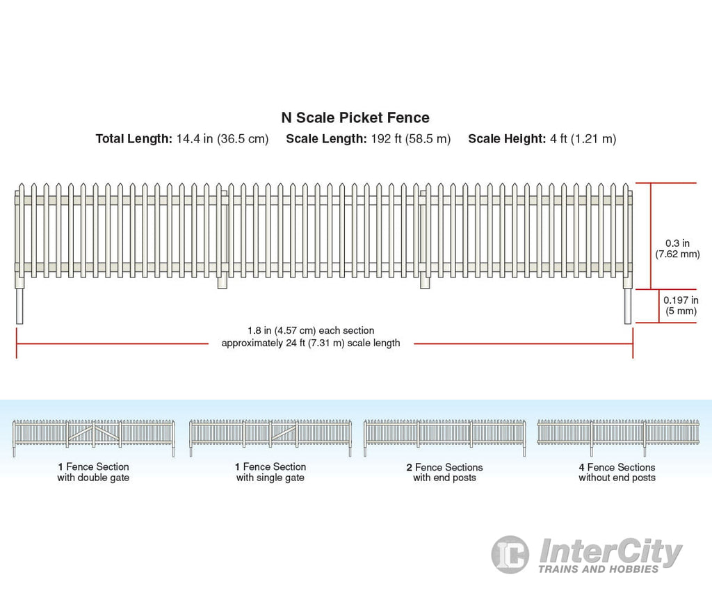 The total length of this fence is 14.4" (36.5 cm), which represents 192 scale ft (58.5 scale m). The scale height is 4 ft (1.21 m).
