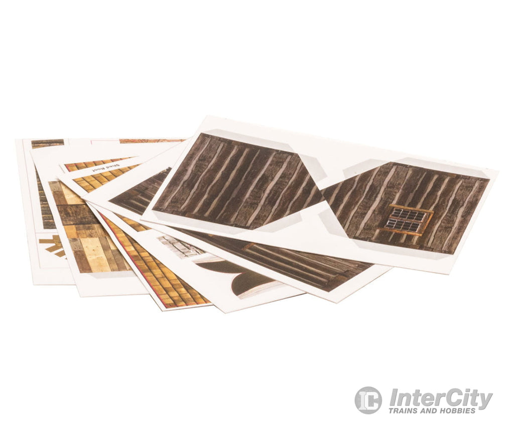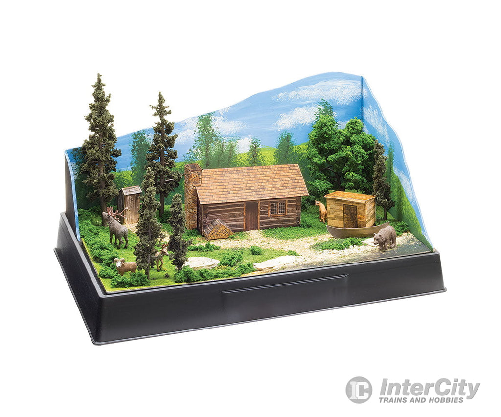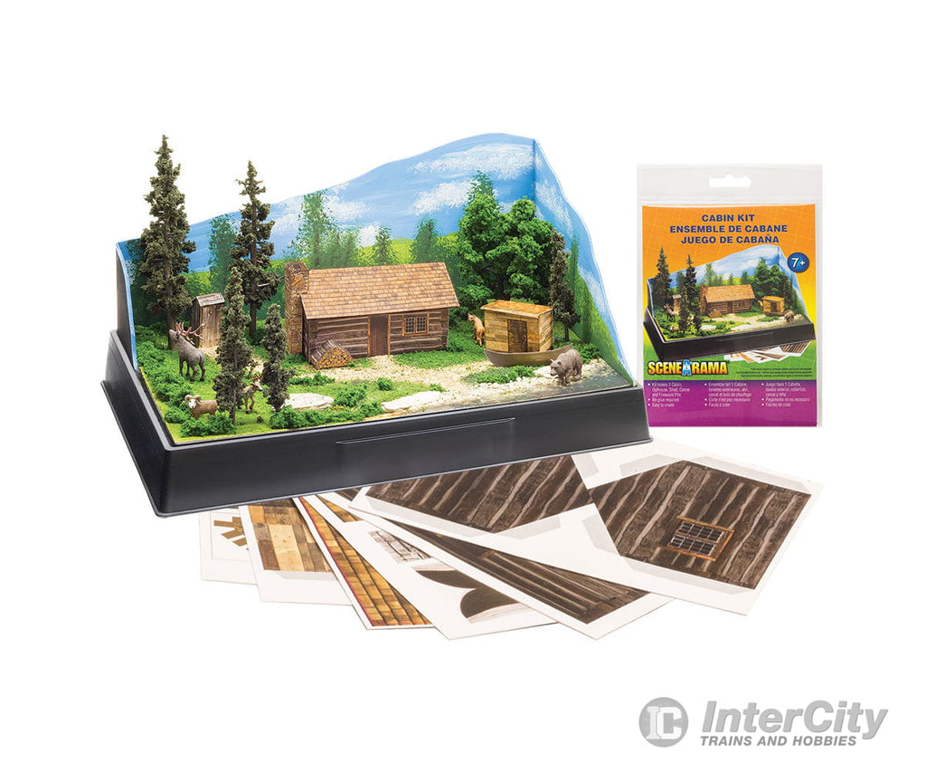 Pre-cut graphics and materials to make a cabin with a stack of firewood outside, an outhouse, a detached shed and a boat. Kit contents are easy to assemble.