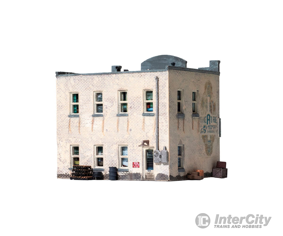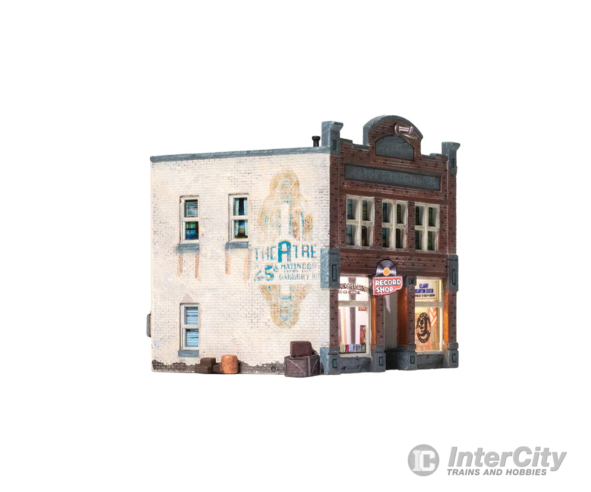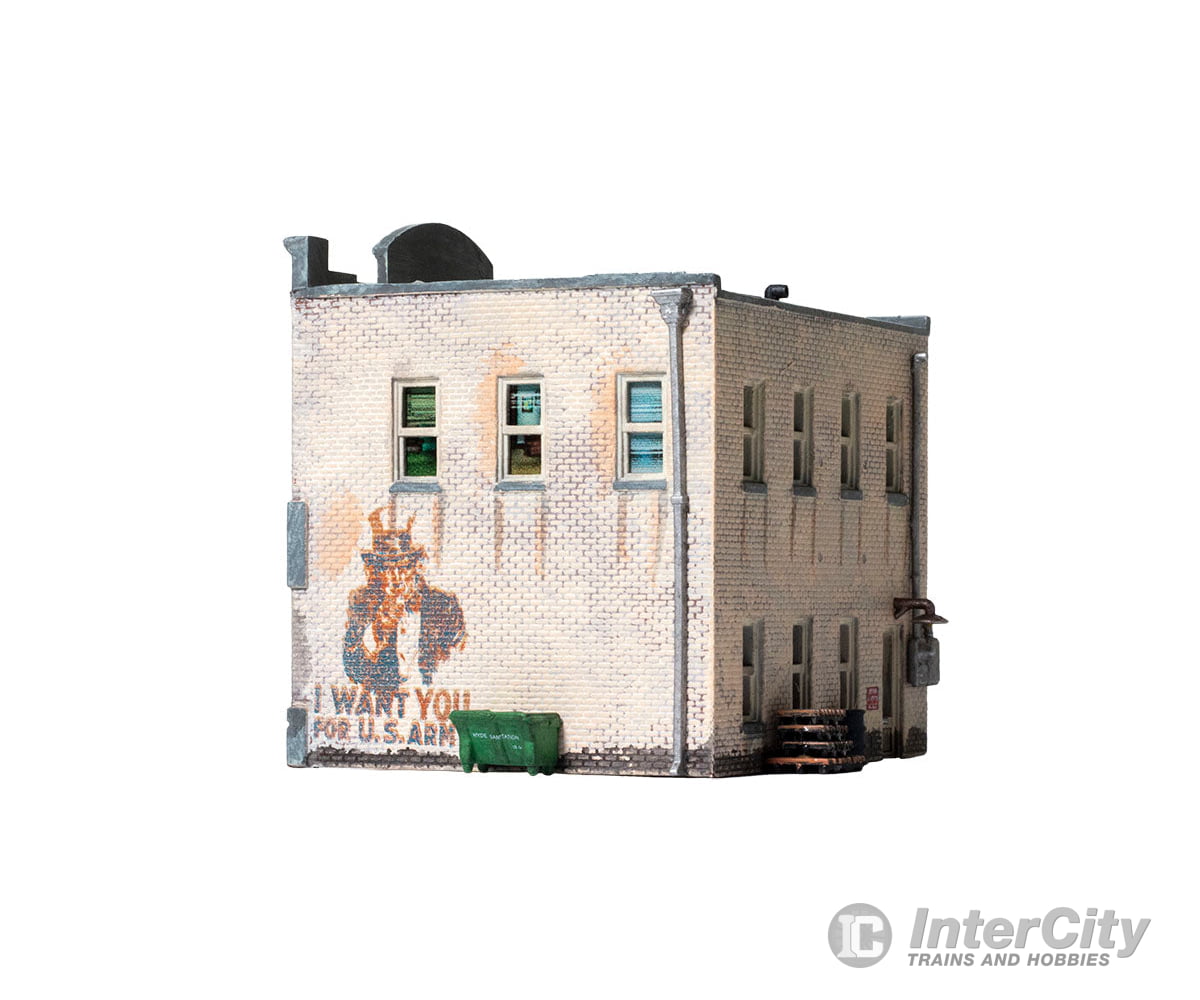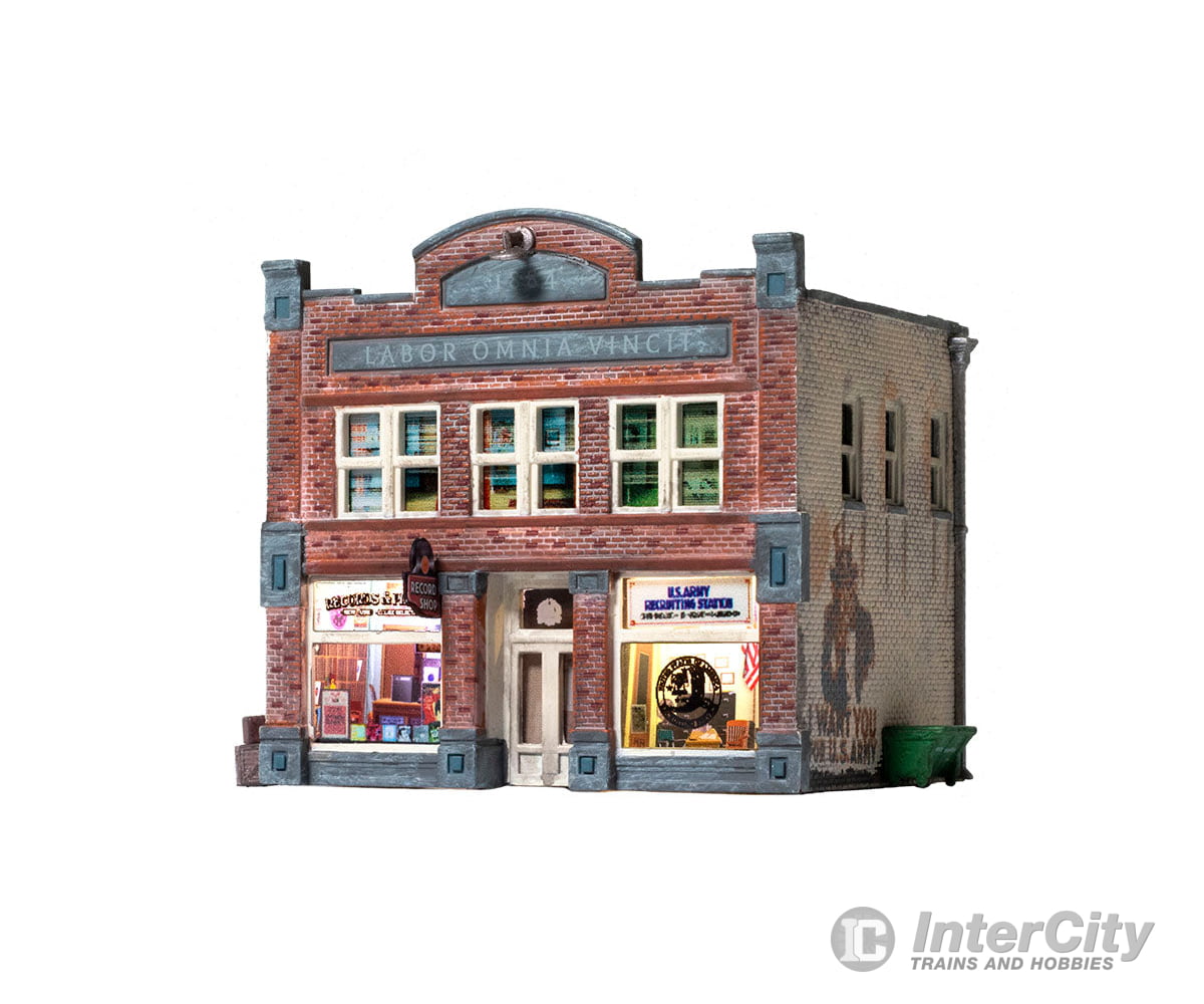 Whether you seek vinyl or valor, this Built-&-Ready building is the place for you. The structure features eye-catching printed interiors of a record shop, an Army recruiting office and cozy apartments upstairs. Blinds cover the windows above the bustling businesses. It is hand-painted and authentically weathered. There are also exterior details like crates and barrels, as well as decals and signage.