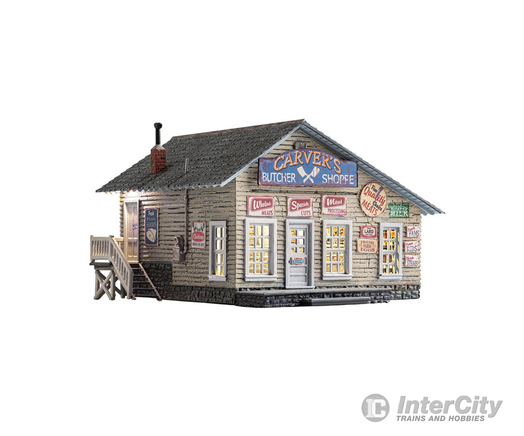 Every town has a local butcher to supply the finest cuts around, and N Scale Carver's Butcher Shoppe only offers the best. This building is hand-painted with authentic weathering, including peeling paint and worn cedar shake shingles on the roof. The interior features a 3D meat counter with a selection of the freshest delicacies. If you peek into the windows of the loading dock door, you'll see a variety of meats hanging for the best flavor and tenderness. Additional features include loads of signage, stairs, a water hose and an entryway porch.