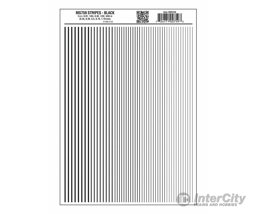 Stripe sizes: 0.01", 1/64", 0.022", 1/32", 3/64" (0.25 mm, 0.39 mm, 0.55 mm, 0.79 mm, 1.19 mm)